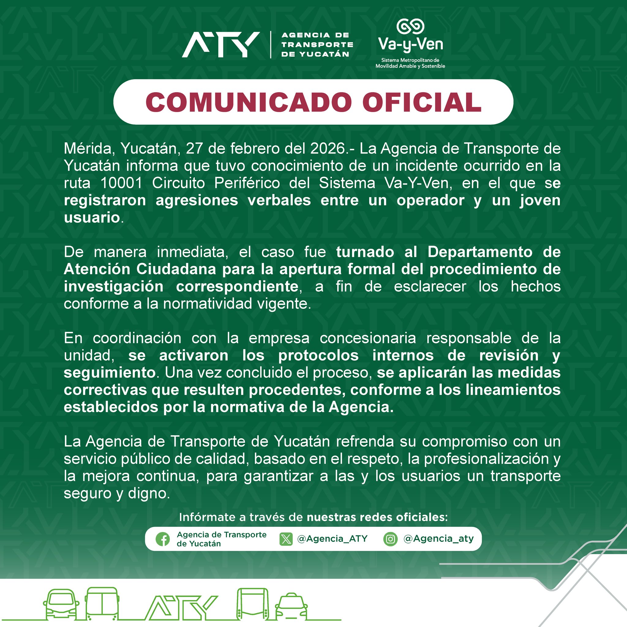 Tras darse a conocer estos hechos, la Agencia de Transporte de Yucatán (ATY) emitió un comunicado, en el cual indicó que el caso fue turnado al Departamento de Atención Ciudadana para la apertura formal del procedimiento de investigación correspondiente.