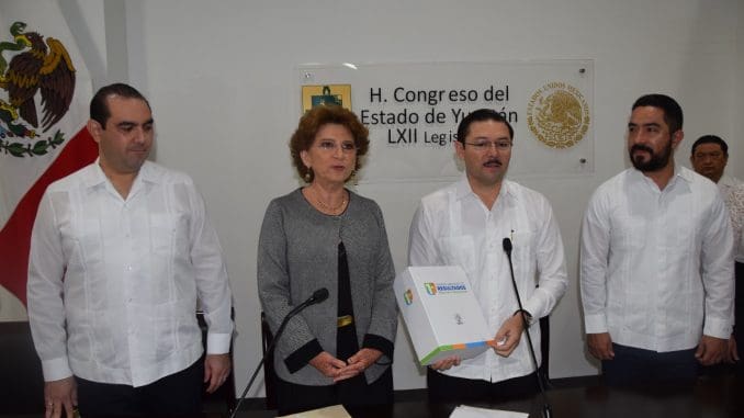 Por instrucciones del Gobernador Vila Dosal, la titular de la Secretaría General de Gobierno (SGG), María Fritz Sierra, acudió esta mañana al recinto legislativo para realizar la entrega de dicho documento en físico y formato digital, mismo que recibió el presidente de la diputación permanente del Congreso del Estado, Enrique Castillo Ruz.