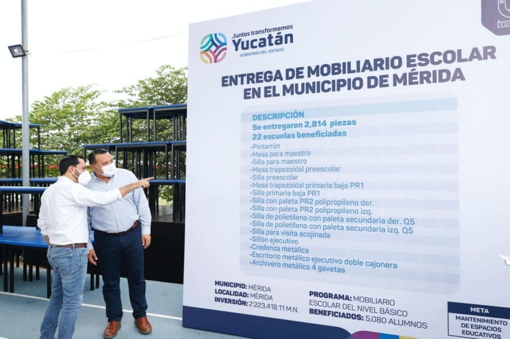 En total, este día se entregaron 2,814 piezas de mobiliario, entre mesas tipo trapezoidal, sillas, sillas con paleta derecha e izquierda, credenzas, escritorios y archiveros, entre otras para los mencionados 22 planteles educativos de esta capital, en donde cursan sus estudios 5,080 niños y jóvenes yucatecos.