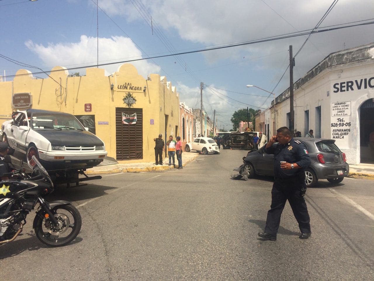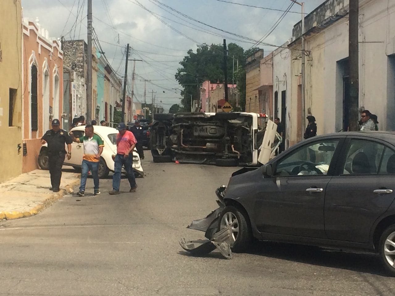 Mérida, Yucatán, 31 de mayo de 2018.- Un fuerte accidente de tránsito ocurrió esta mañana en la calle 49 por 70 del Centro Histórico, en donde estuvieron involucrados cuatro automóviles, de los cuales una camioneta terminó volcada.