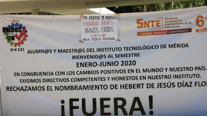 Mérida, Yucatán, 6 de febrero del 2020.- Ante el nombramiento del director Heberth de Jesús Díaz Flores, maestros del campus Norte y Poniente del Tecnológico de Mérida iniciaron esta mañana huelga de brazos caídos, afectando a los más de 6 mil alumnos de la institución.