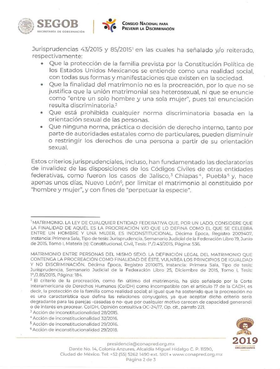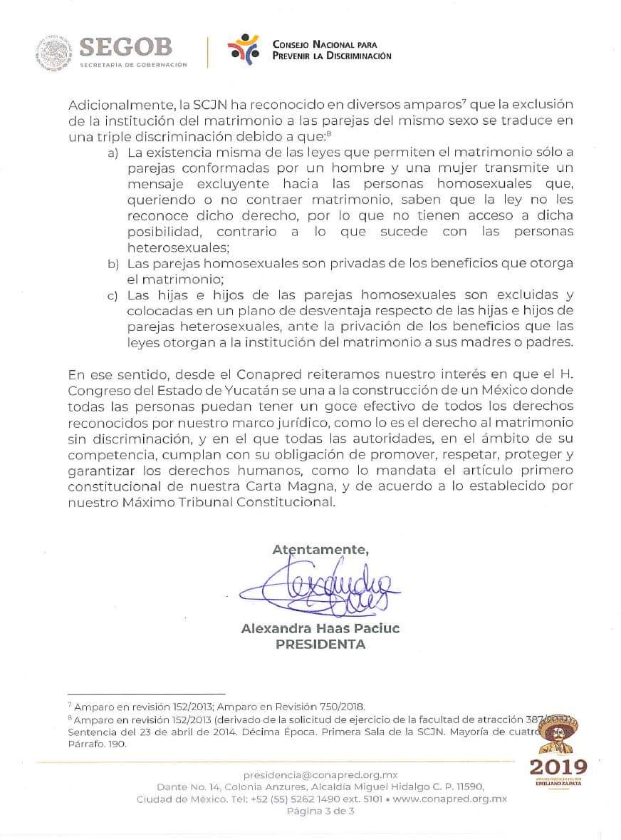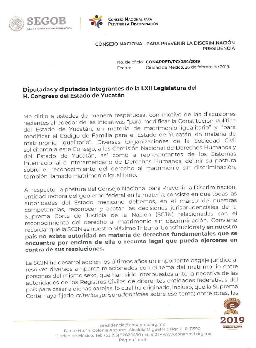 -«Desde el Conapred reiteramos nuestro interés de que el H. Congreso de Yucatán se una en la construcción de un México donde todas las personas puedan tener un goce efectivo de todos los derechos reconocidos en nuestro marco jurídico, como lo es el matrimonio sin discriminación y en el que todas las autoridades, en el ámbito de su competencia, cumplan con su obligación de promover, respetar, proteger y garantizar los derechos humanos.