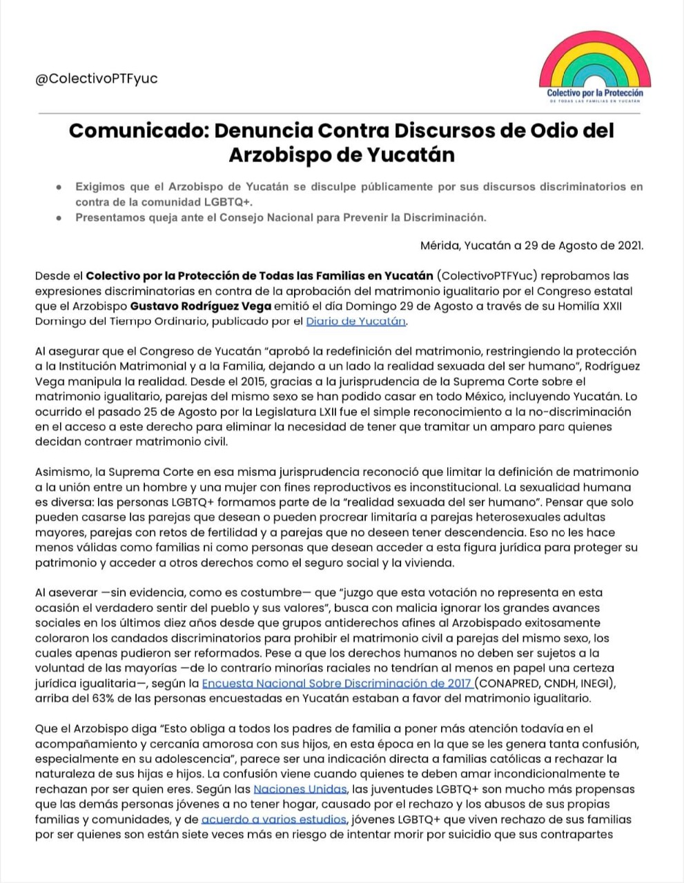 Mérida, Yucatán, 30 de agosto de 2021.- El Colectivo por la Protección de Todas las Familias en Yucatán (ColectivoPTFYuc) denunció al Arzobispo de Yucatán, Gustavo Rodríguez Vega, ante el Consejo Nacional para Prevenir la Discriminación (Conapred) porque asegura hizo comentarios de odio y discriminatorios en contra de la comunidad LGBTQ+, por lo que también exigen una disculpa pública.