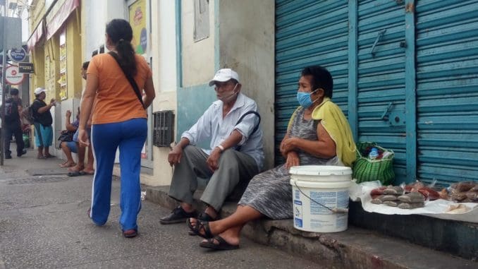 Una pareja de abuelos hace todo lo posible por obtener recursos económicos a pesar del riesgo que representa salir de casa y exponerse al contagio del Covid-19. Los ancianos decidieron vender condimentos que ellos mismos preparan y que ofrecen frente al mercado San Benito, en el centro de Mérida. Fotografía: Jorge Euán.