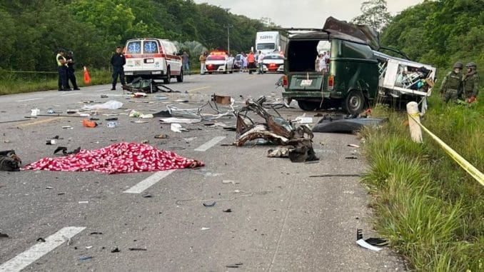Bacalar, Q. Roo, a 24 de junio de 2023.- Esta mañana, una camioneta del tren maya y una combi particular se estrellaron de frente esta mañana en la carretera federal 307, cerca de Buenavista, causando la muerte de dos hombres. Una mujer y un bebé resultaron lesionadas.