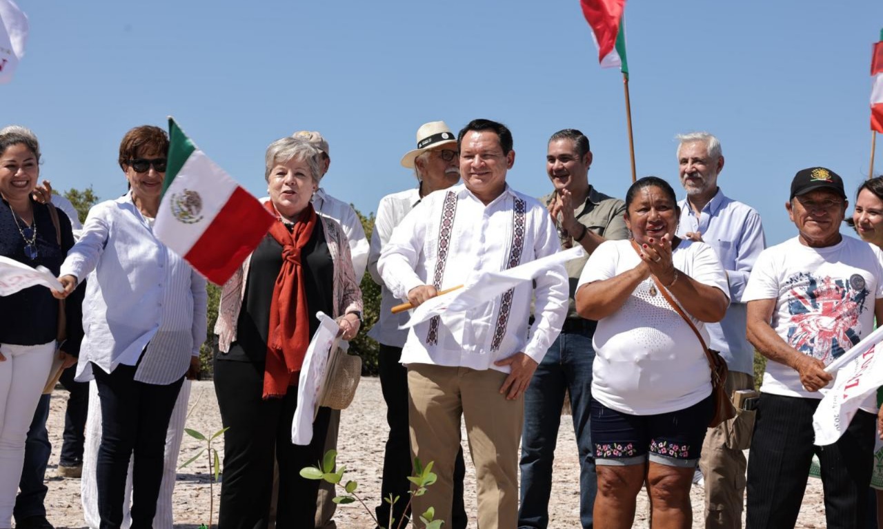 En el puerto de Chuburná, el Ejecutivo estatal y la funcionaria federal realizaron el banderazo de inicio de la siembra de más de 100 mil ejemplares de mangle rojo, negro y verde, que se colocarán a lo largo de la costa como una medida de protección ante fenómenos meteorológicos, así como para la preservación de la biodiversidad.
