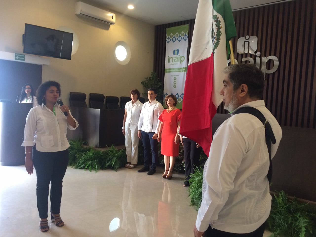 Mérida, Yucatán, 11 de abril de 2018.- Esta mañana se llevó a cabo la ceremonia de abanderamiento en las instalaciones del Instituto Estatal de Transparencia, Acceso a la Información Pública y Protección de Datos Personales (INAIP), como parte de la estrategia para fortalecer los valores cívicos y patrios entre los 70 trabajadores de este organismo autónomo.