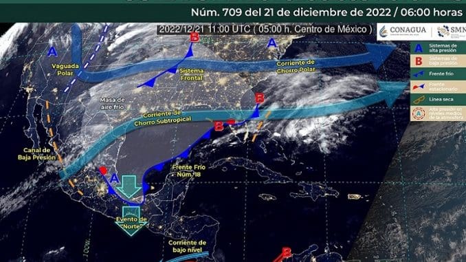 El paso del frente frío 18 por la Península de Yucatán, junto con una vaguada, ocasionaría más nublados y chubascos en el oriente, centro y sur de Yucatán; en el centro y sur de Campeche, así como en el centro y sur de Quintana Roo.
