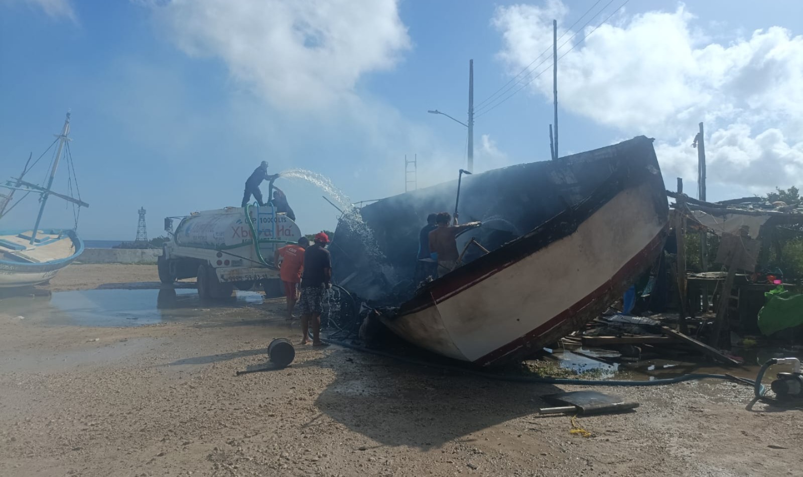 Dzilam de Bravo, a 25 de julio de 2024.- Este jueves, un barco se incendió en el puerto de abrigo, generando una fuerte movilización de la Policía Municipal para controlar el fuego.