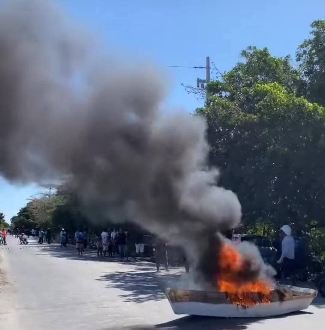 Progreso, a 25 de febrero de 2026.- Pescadores del puerto de abrigo de La Caleta bloquearon el libramiento que lleva a ese refugio pesquero en protesta por el decomiso de embarcaciones y productos del mar por parte de la Secretaría de Marina (SEMAR) y la Comisión Nacional de Acuacultura y Pesca (Conapesca).