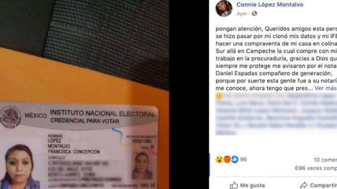 En un mensaje, López Montalvo denunció: “esta persona se hizo pasar por mi, clonó mis datos y mi INE para hacer la compra-venta de mi casa en Colinas del Sur allá en Campeche, la cual compré con mi trabajo en la Procuraduría”.