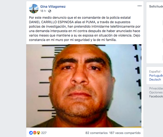 «Por este medio denuncio que el ex comandante de la policía estatal DANIEL CARRILLO ESPINOSA alias el PUMA, a través de supuestos policias de investigación, han pretendido intimidarme telefónicamente por una demanda interpuesta en mi contra después de haber anunciado hace varios meses que mantiene a su ex esposa en situación de violencia. Dejo constancia en mi muro por mi seguridad y la de mi familia»