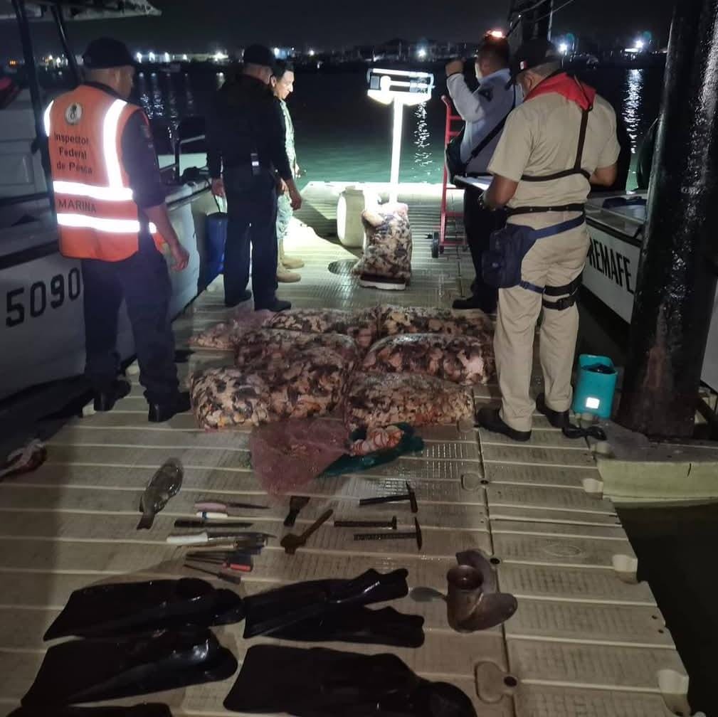 Los detenidos, que fueron puestos a disposición de las autoridades correspondientes y, de acuerdo con la Semar, durante en un operativo sus elementos revisaron una embarcación menor en la zona del puerto de Progreso, en la cual se hallaron 359 kilos de caracol rosado, especie en veda permanente, y 4 kilos de mero, cuya veda inició el 1 de febrero y concluye el 31 de marzo.