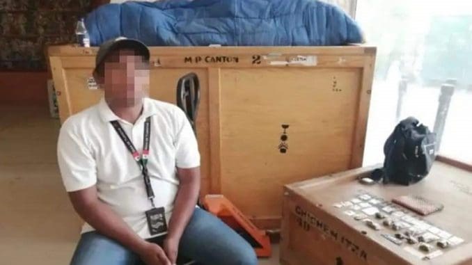 Mérida, Yucatán, 28 de abril del 2023.-Elementos de la Guardia Nacional arrestaron a Eli Adonías Y.C., quien era guía de turistas en la zona arqueológica de Chichén Itzá, pero fue descubierto en posesión de diferentes tipos de drogas que ofrecía a los visitantes nacionales e internacionales.