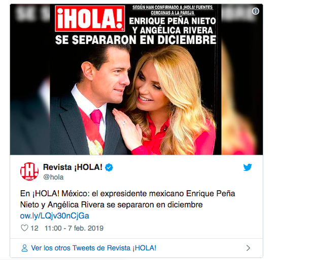 La revista ¡Hola! publicó que, de acuerdo con fuentes cercanas a la pareja, el ex presidenteEnrique Peña Nieto y Angélica Rivera se separaron en diciembre pasado.