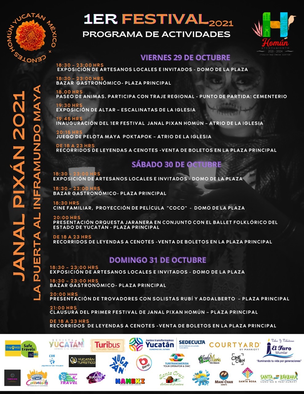 Entre las actividades del Festival destacan los recorridos a cenotes donde se contarán las leyendas mayas con elementos ilustrativos de las mismas. Habrá exposición de artesanos locales e invitados; bazar gastronómico; paseo de ánimas con traje regional; exposición de altares; presentación de trovadores, entre otras actividades.