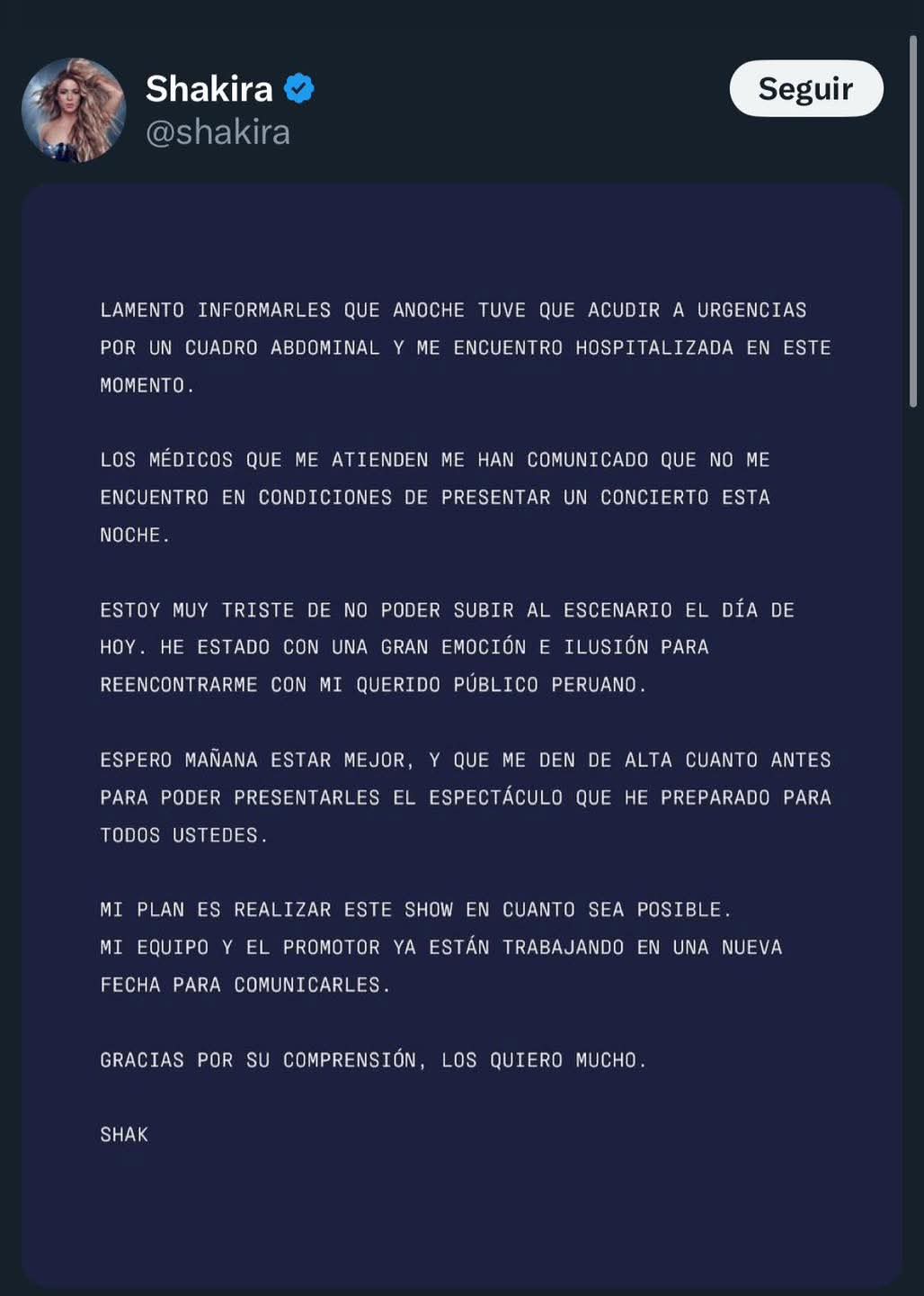 Perú, a 16 de febrero de 2025.- Este domingo, la cantante colombiana Shakira fue hospitalizada tras presentar malestares abdominales, lo que la obligó a posponer su concierto programado para hoy en el Estadio Nacional de Lima.