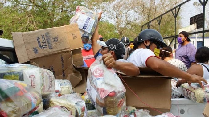 Mientras, el alcalde Freddy Ruz continuó entregando despensas en compañía de la Guardia Nacional