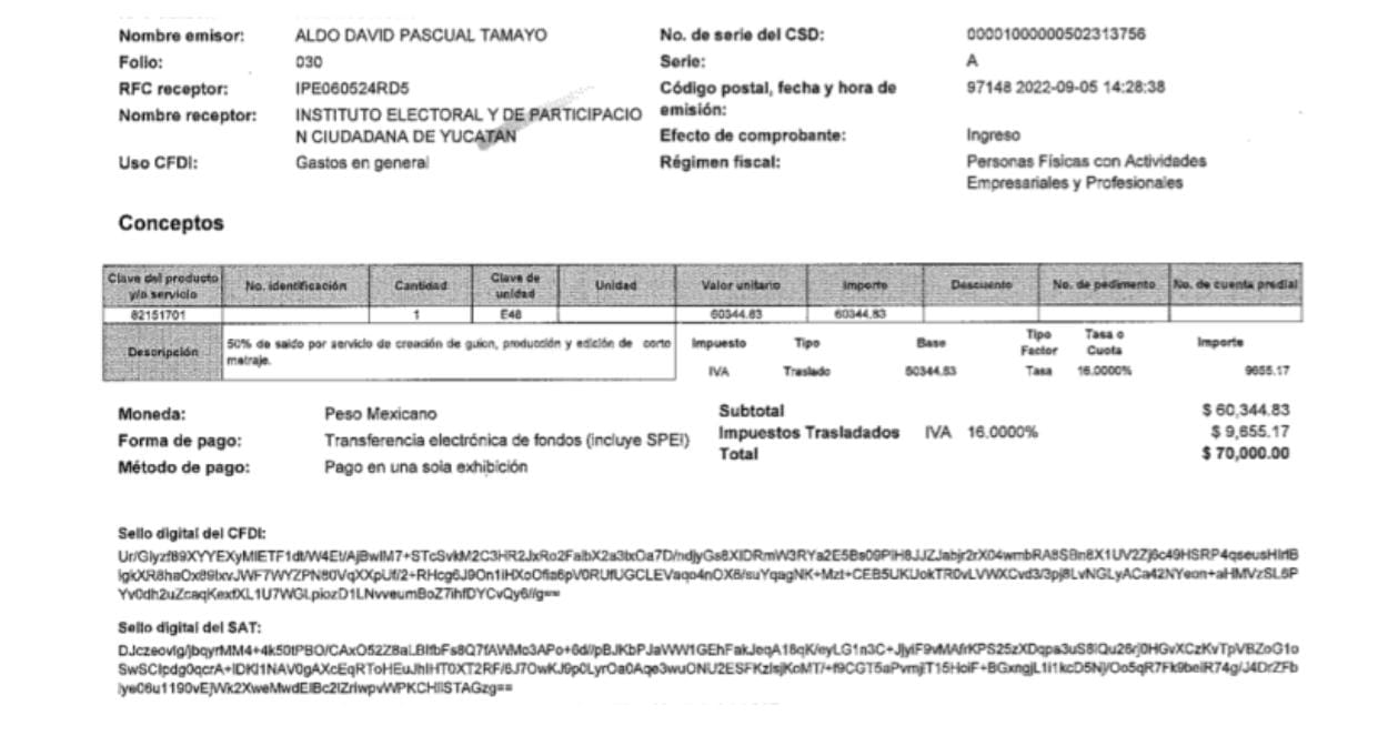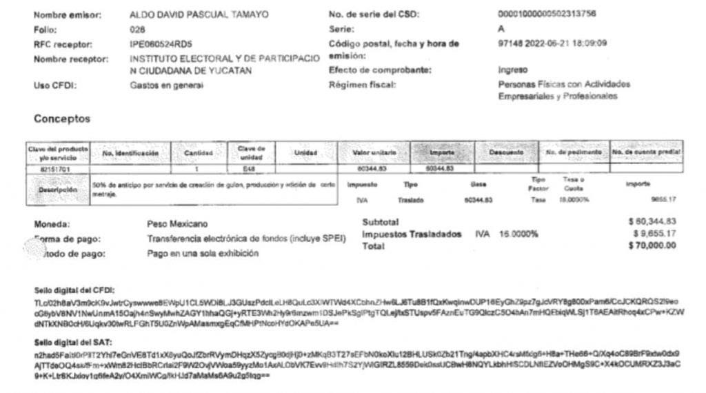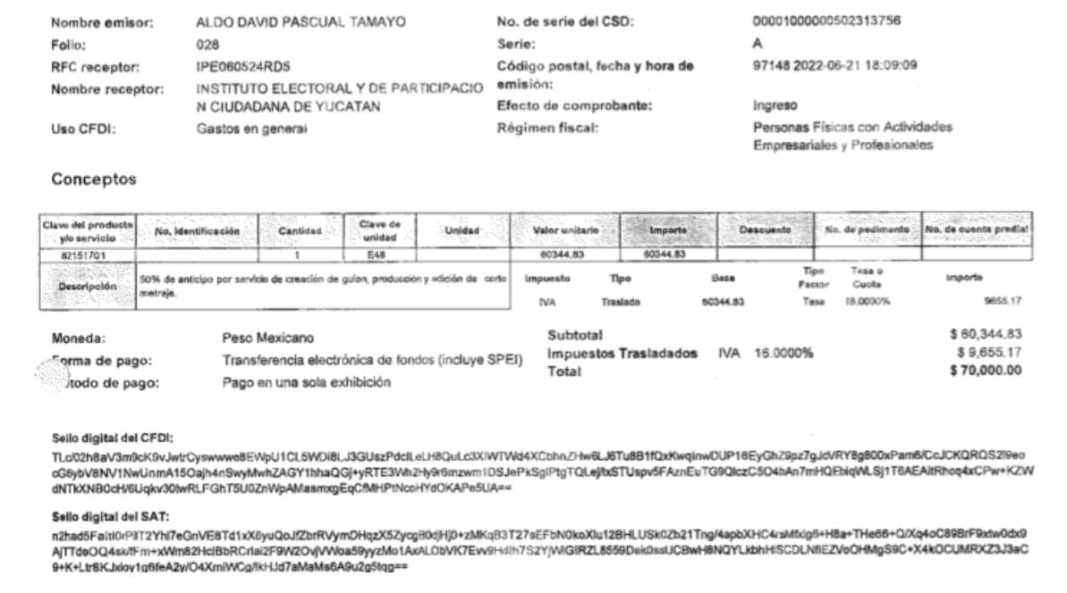 Precisó que este comediante realizó un cortometraje para fomentar la democracia en los jóvenes, y señaló que la primera factura está fechada el 21 de junio y la segunda el 5 de septiembre de este año.