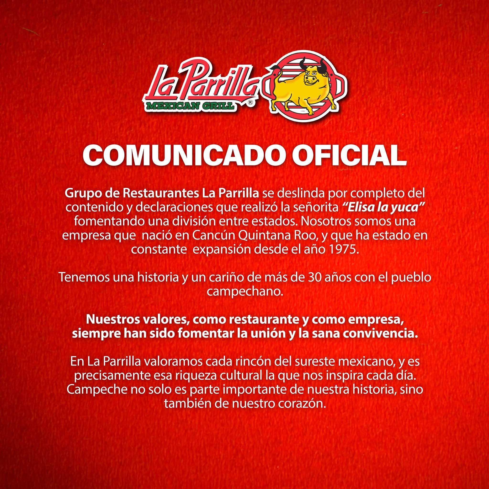 Sin embargo y luego de la polémica generada en redes sociales por los comentarios de la influencer, el restaurante La Parrilla Campeche emitió un comunicado oficial para deslindarse de sus declaraciones.