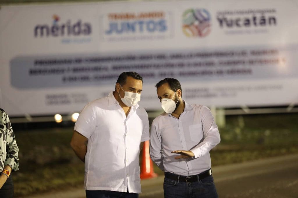 Mérida, Yucatán, 26 de febrero de 2021.- El Gobernador Mauricio Vila Dosal y el alcalde de esta ciudad, Renán Barrera Concha, pusieron en marcha los trabajos de repavimentación de 10 kilómetros críticos del Anillo Periférico de Mérida, proyecto contemplado en el Programa Conjunto de Mejora a la Movilidad y la Infraestructura Vial, que vendrá a ofrecer un traslado más ágil, pero, sobre todo, más seguro para quienes circulan por esta importante vía.