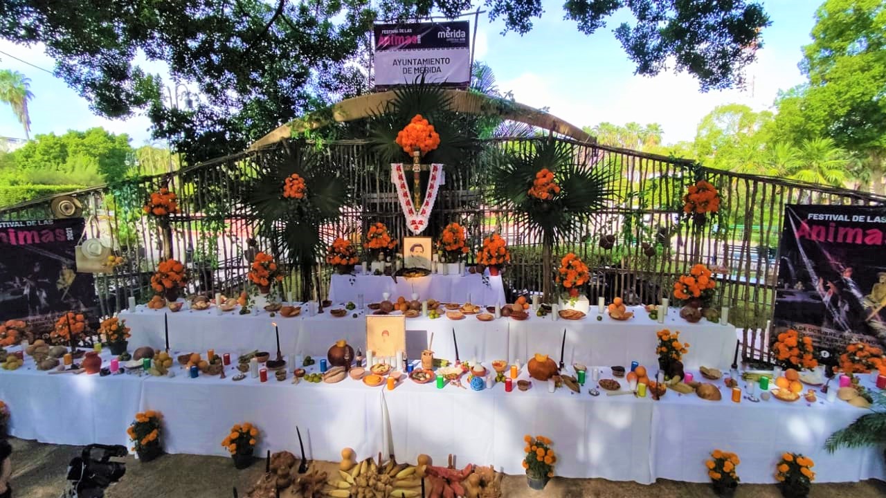 La recreación del tradicional altar que se coloca en las viviendas yucatecas para la celebración del Hanal Pixán (Comida de ánimas) en los días en que se espera la visita de los fieles difuntos, fue instalado en la Plaza Grande de la capital yucateca.