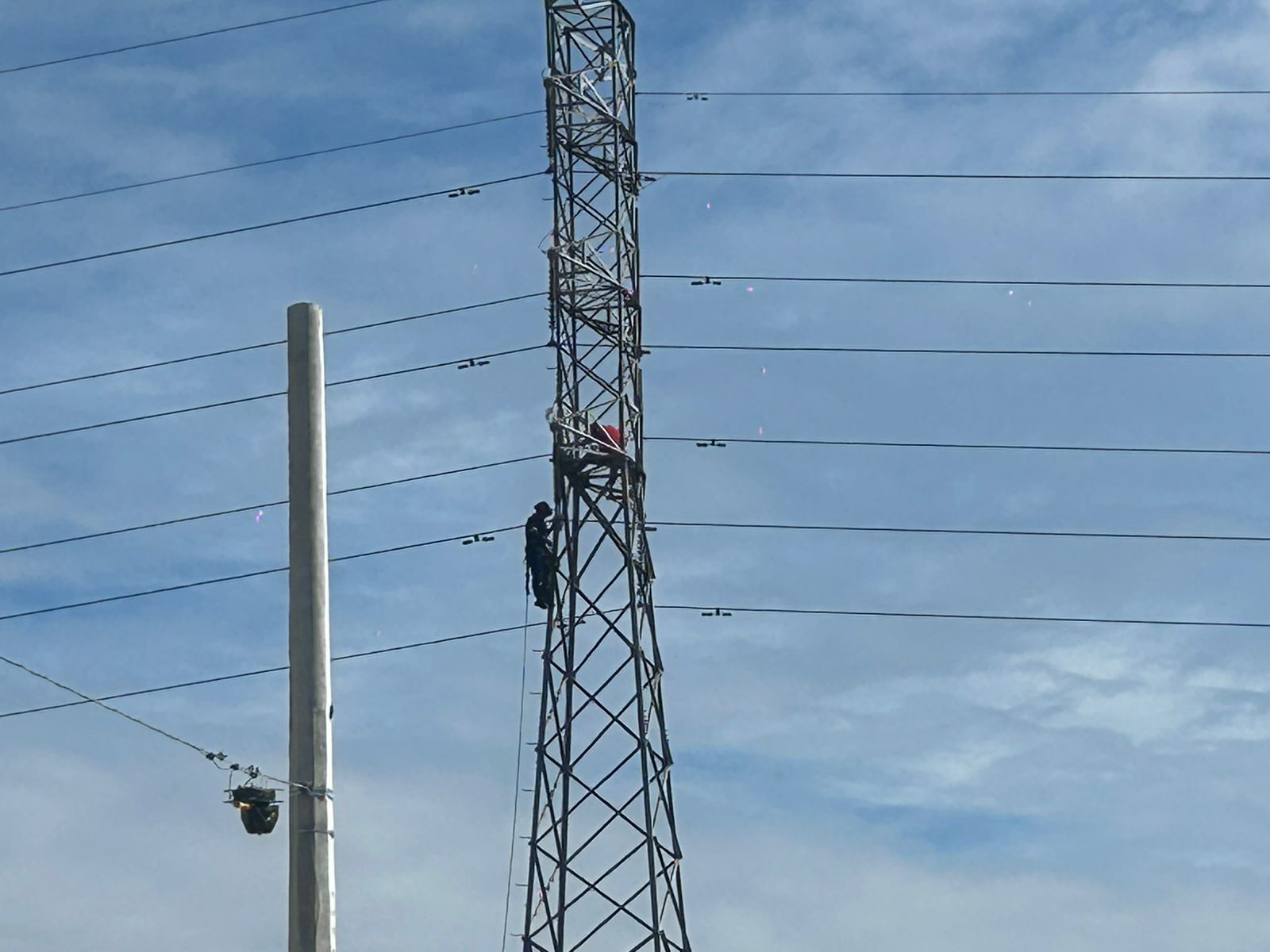 Mérida, a 10 de octubre de 2024.- Una rápida movilización de cuerpos de emergencia tuvo lugar esta mañana en el fraccionamiento San Ángel, Kanasín, debido a que un hombre escalara una torre de alta tensión de la Comisión Federal de Electricidad (CFE), y amenazaba con lanzarse al vacío.