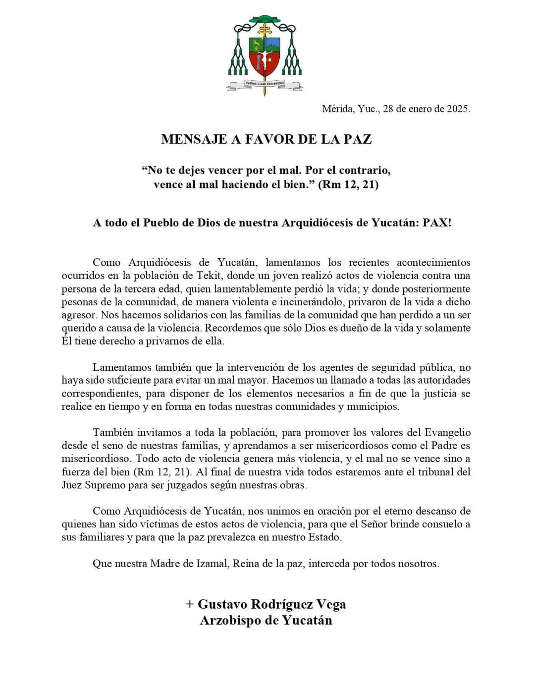 En un “Mensaje a favor de la paz” afirmó que la Arquidiócesis de Yucatán es solidaria con las familias de Tekit que han perdido a un ser querido a causa de la violencia y recordó que “sólo Dios es dueño de la vida y solamente Él tiene derecho a privarnos de ella”.