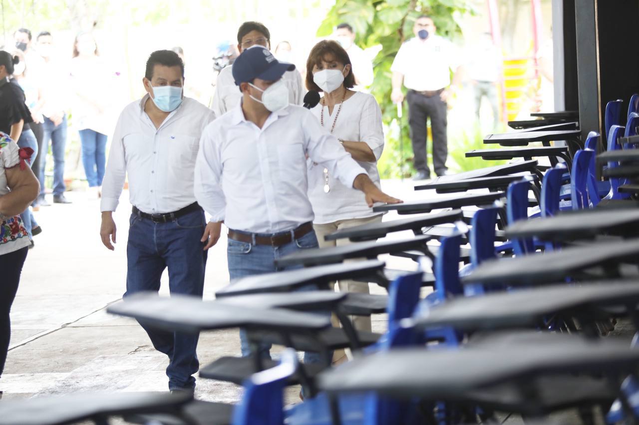 Junto con alcalde de anfitrión, Rodolfo Castillo Huchim, Vila Dosal constató la entrega de un total de 958 nuevas piezas de mobiliario en beneficio de los alumnos de ésta y otras 13 escuelas de nivel básico pertenecientes a comisarías de San Mateo, Cepeda, Cuch Holoch, Dzidzibachí, Kancabchén, Santa María Acú y Sihó, así como de la cabecera municipal de Halachó.