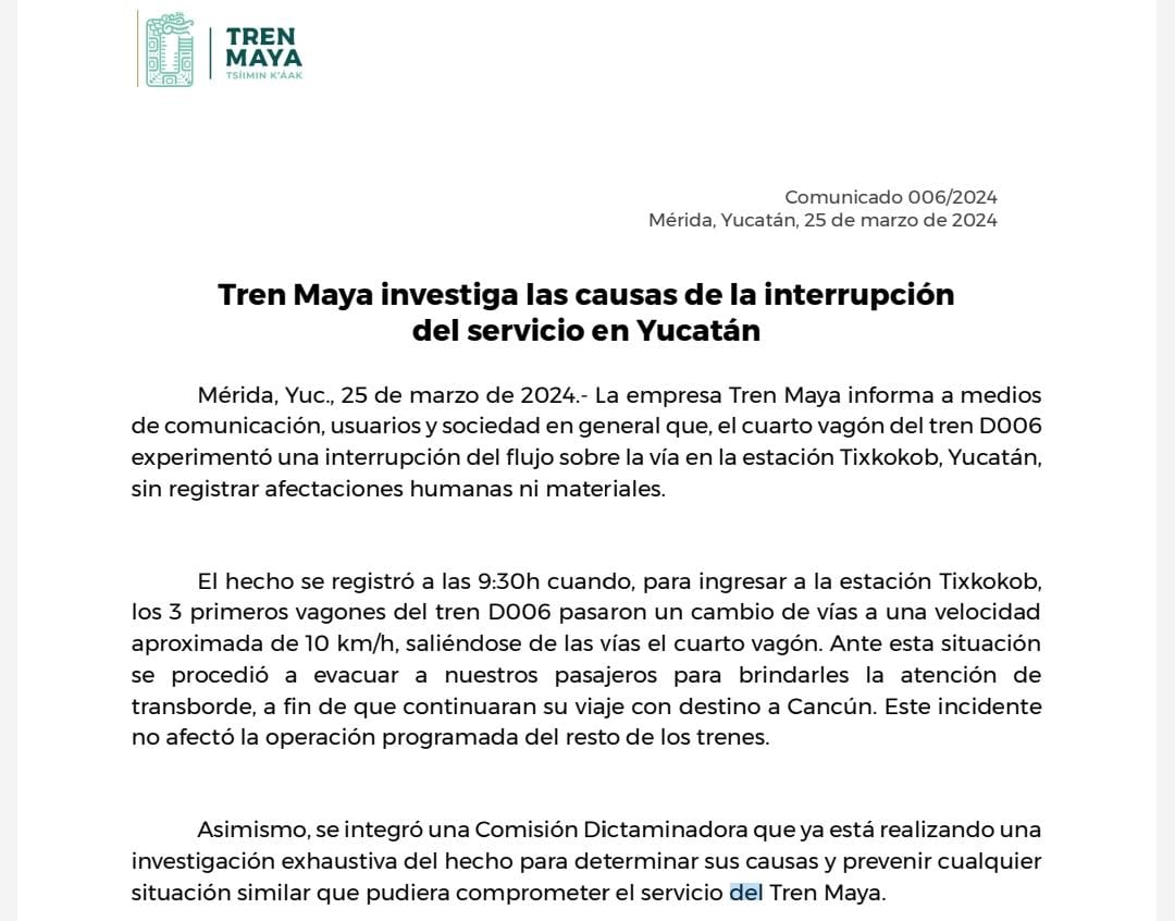 La empresa precisó que el hecho se registró a las 9:30 horas en el ingreso a la estación de Tixkokob, cuando los tres primeros vagones del tren D006 pasaron un cambio de vías a una velocidad aproximada de 10 kph, sin embargo, el cuarto vagón salió de la vía.