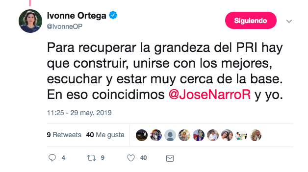 «Para recuperar la grandeza del PRI hay que construir, unirse con los mejores, escuchar y estar muy cerca de la base. En eso coincidimos @JoseNarroR y yo», escribió Ortega Pacheco.