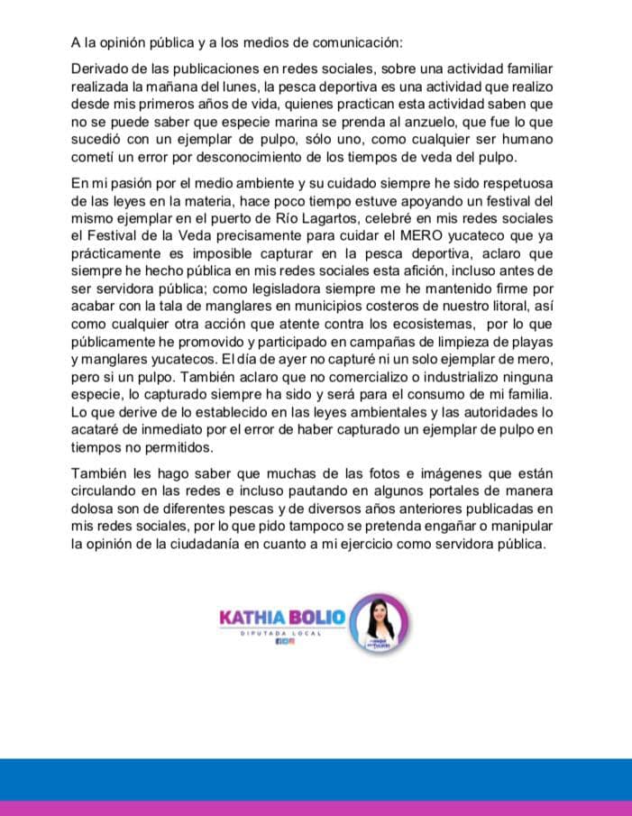 Como informó Desde El Balcón, el día de ayer se dio a conocer unas imágenes en el Facebook oficial de la diputada en donde se podía observar a Bolio Pinelo con un ejemplar de pulpo y algunos peces más; en un principio se especuló que se trataban de ejemplares de mero, pero la servidora pública lo desmintió y explicó que solo —por error— capturó un sólo pulpo.