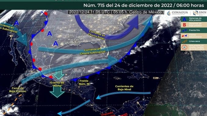 El frente frío 19 se extenderá sobre oriente de la península de Yucatán y dejará cielo nublado en gran parte de la península; se espera una Nochebuena y lluviosa, con lluvias fuertes en el noreste, norte y noroeste de Yucatán; en el norte y centro de Quintana Roo, así como muy fuertes en el suroeste y sur de Campeche.