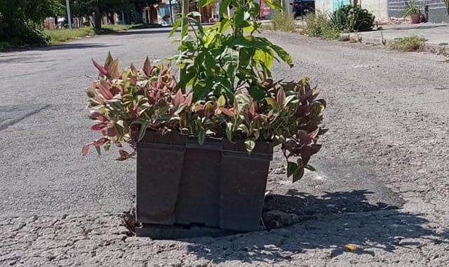 Un usuario de las redes sociales publicó esta foto donde se aprecia que los vecinos de Residencial Pensiones pusieron una maceta improvisada en un mega bache.