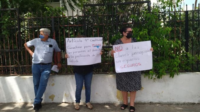 De igual forma, uno de los representantes, Víctor Enríquez Cabrera, dijo que la principal petición es que las clases para las escuelas públicas sean a distancia, ya que argumentó que así estarán operando aquellos centros educativos privados. Advirtió que así como ellos, varios docentes, pero del interior del estado, ya se están organizando para pedir medidas similares.