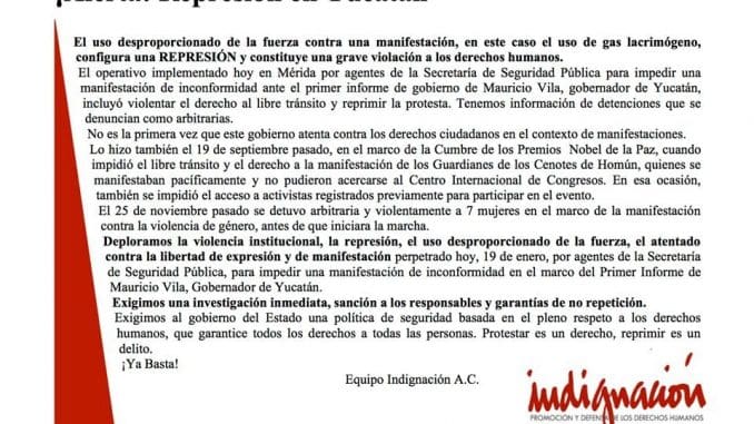 Mérida, Yucatán, 20 de enero de 2020.- A través de sus cuentas de redes sociales, el Grupo Indignación lamentó el uso desproporcionado de la fuerza contra una manifestación, en este caso, el uso de gas lacrimógeno, ya que constituye una grave violación a los derechos humanos.