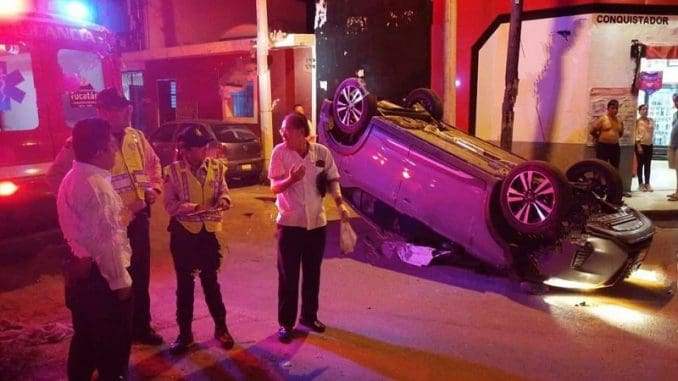 Mérida, Yucatán, 27 de julio del 2023.-De cabeza terminó una camioneta Kicks tras haber sido chocada por un vehículo March en la calle 39 con 52 cerca del Centro de Mérida. Además de policías, al lugar llegaron paramédicos para atender a los involucrados y pasajeros.