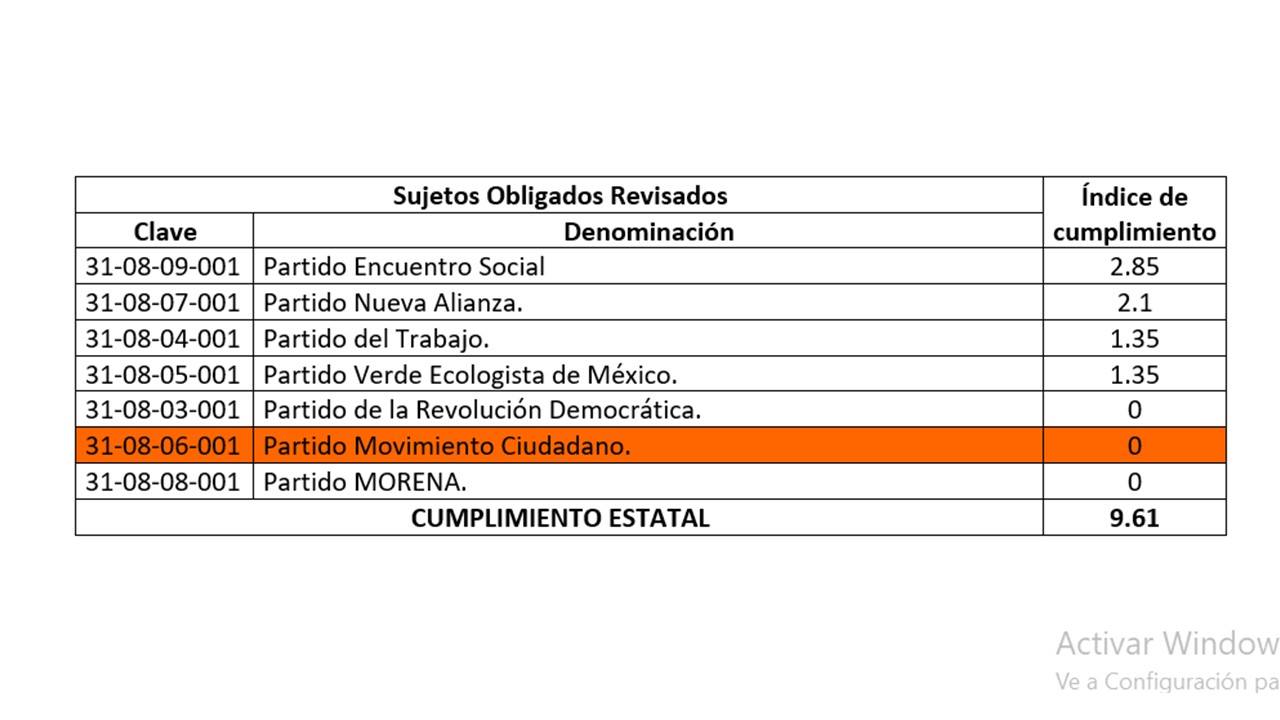 De acuerdo al Resultado del Programa de Vigilancia 2017 del Instituto Estatal de Transparencia, en el apartado con clave 31-08-06-001, el partido naranja tuvo un índice de cumplimiento de cero. Es decir, que no efectuaron ninguna de las obligaciones que marca la norma.
