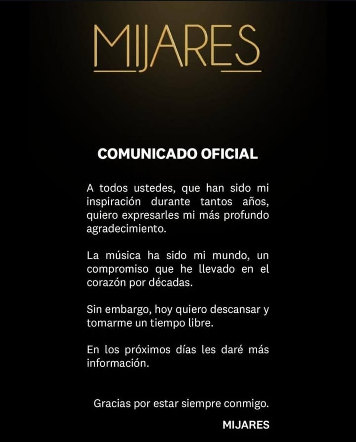 En el mensaje, el artista no especificó la duración de esta pausa ni los motivos específicos detrás de esta decisión, lo que ha generado diversas reacciones entre sus seguidores, aunque adelantó que habrá más noticias sobre su decisión.