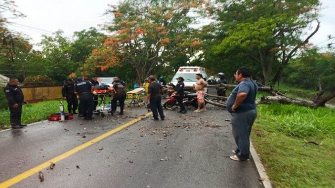 Mérida, Yucatán, 22 de julio del 2023.-Un lamentable incidente ocurrió en el kilómetro 4 del tramo Valladolid-Chichimilá, cuando un árbol impactó a un motociclista y a su pasajera durante una intensa lluvia, causándoles lesiones.