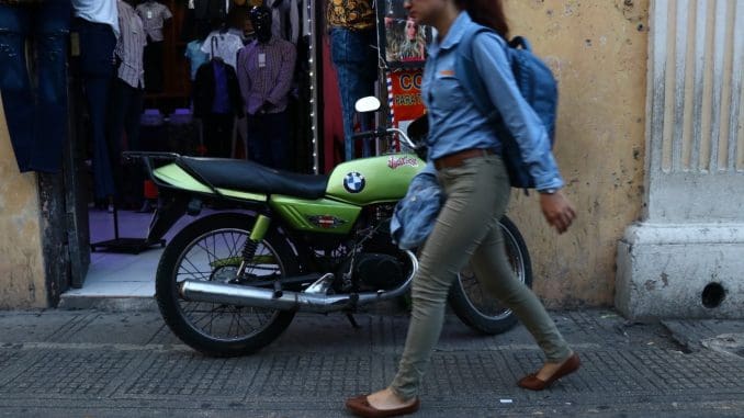 Una persona decidió dejar su motocicleta estacionada en la banqueta, bloqueando el paso a los transeúntes que pasan por ahí. El riesgo es de los propios peatones que tienen que bajarse de la acera para poder pasar y no golpear el vehículo que no debería estar ahí.