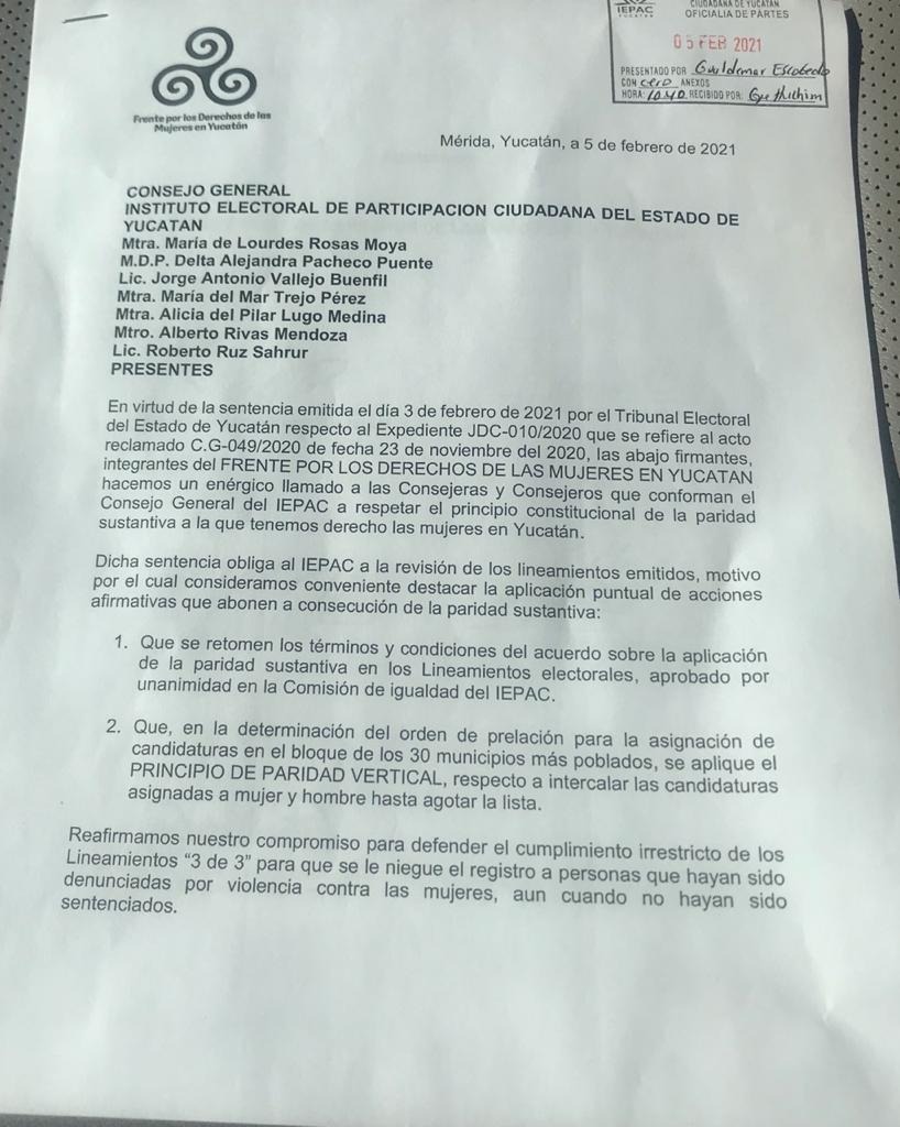 Mérida, Yucatán, 06 de febrero de 2021.– El Frente por los Derechos de las Mujeres en Yucatán, envió una carta al Instituto Electoral y de Participación Ciudadana del Estado (IEPAC) para hacer un “enérgico llamado” a que se respete los principios de paridad sustantiva en el siguiente proceso electoral, y que acaten la sentencia del Tribunal Electoral del Estado (TEEY).