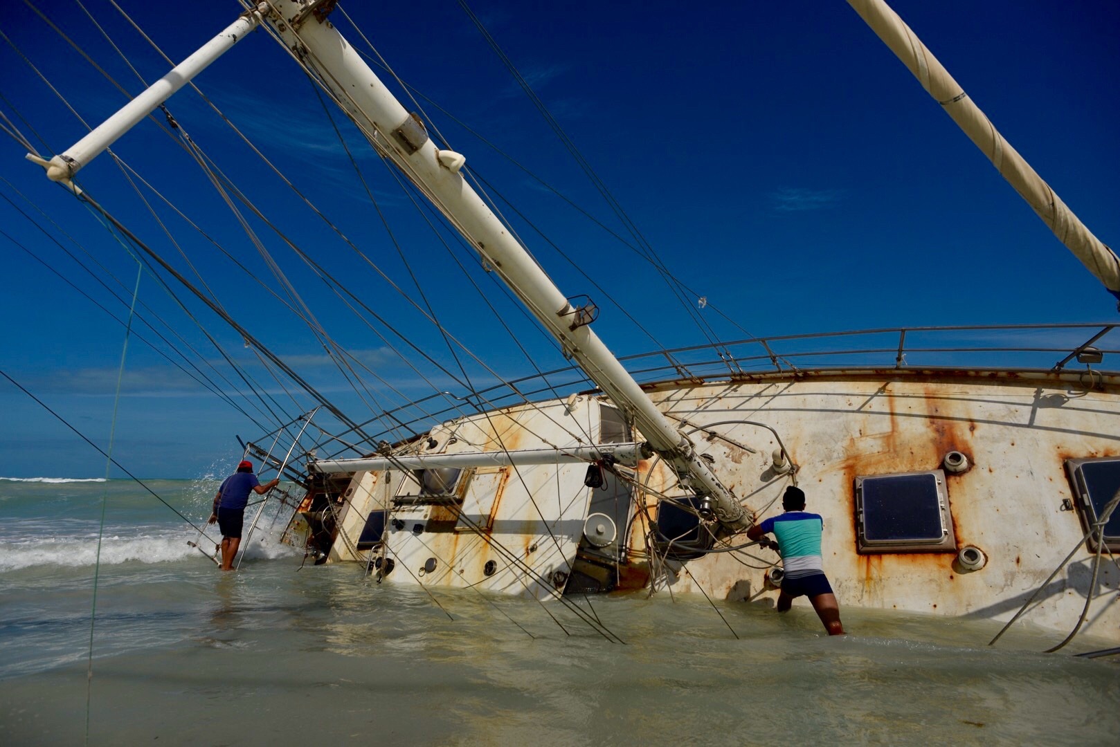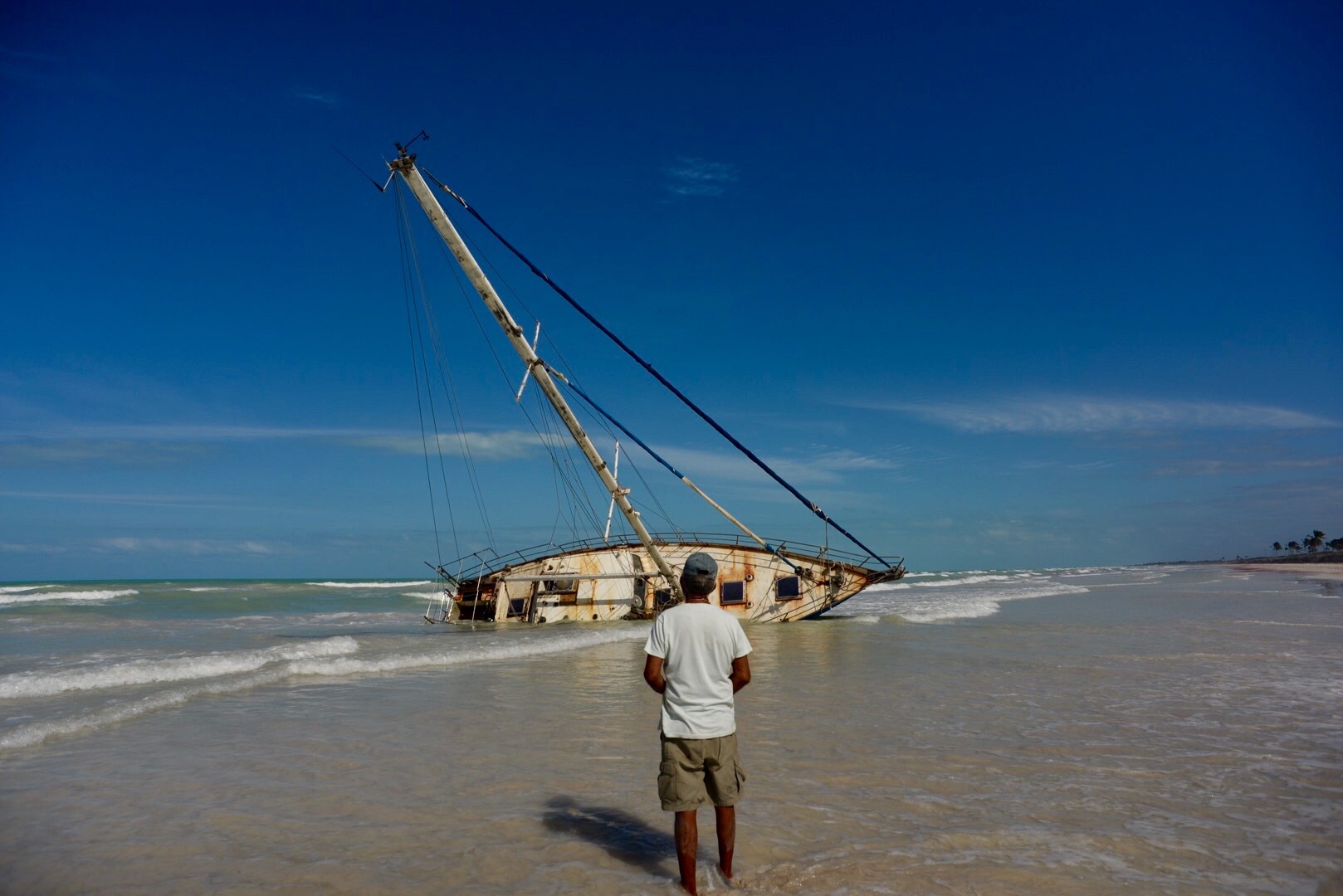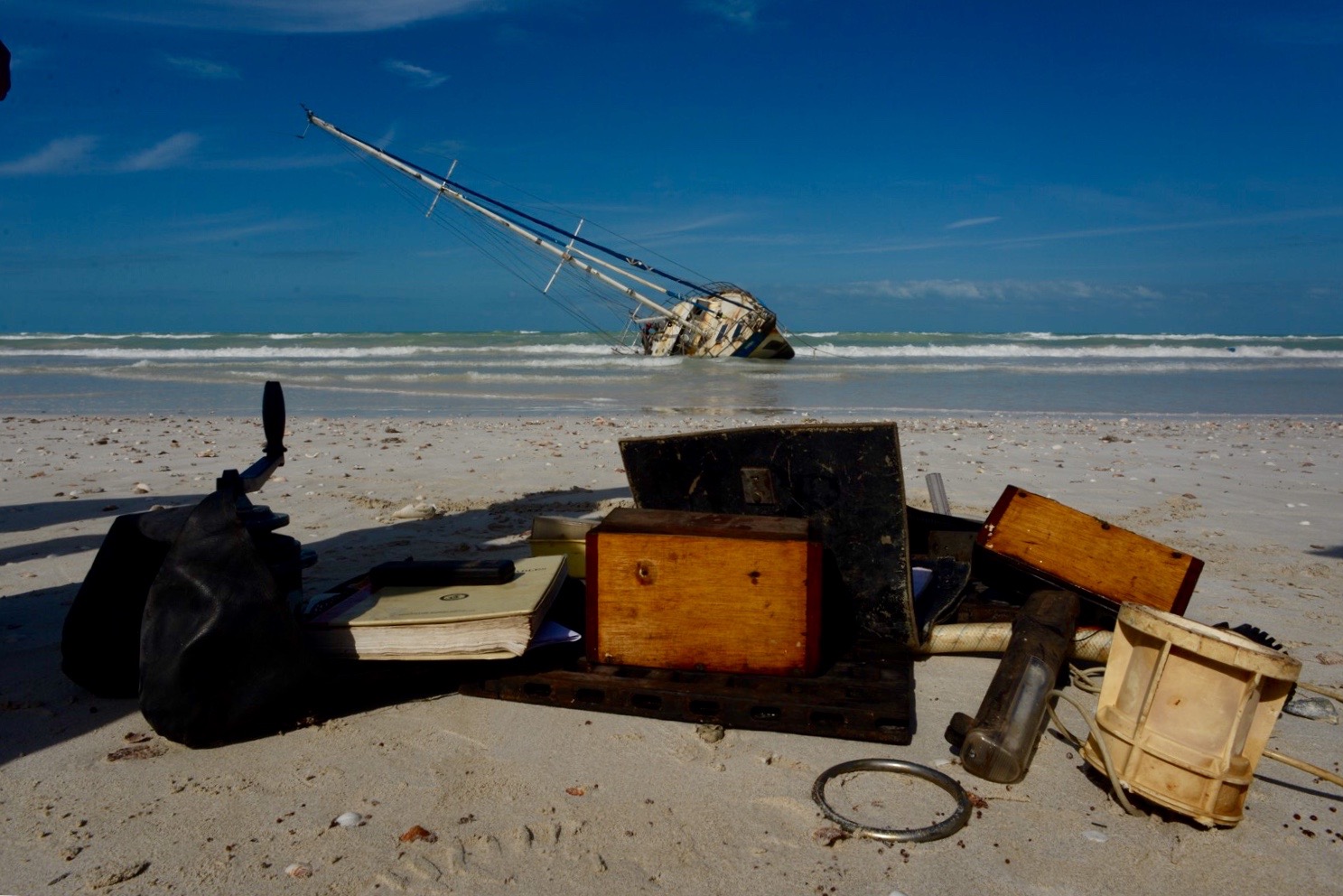 Para llegar al velero se tiene que caminar varios kilómetros en la arena, ahí sigue, no puede flotar. Debido a los golpes que sufrió aquella noche en donde el viento se detuvo y la corriente marina agarró una fuerza impresionante, se abrió un agujero en el tintero, en la parte inferior de la nave.