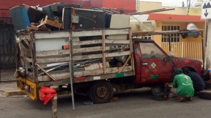 «Vencida por el cansancio» esta vetusta camioneta no resistió más y se desplomó bajo su pesada carga de chatarra. Por ello, sus dueños, sabiendo que de ella depende su sustento económico, no dudaron en aplicarle los «primeros auxilios» para que continúe recorriendo las calles del centro de Mérida.