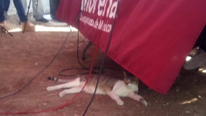 Mientras los morenistas en Yucatán se dividen y acusan mutuamente por la imposición en sus candidaturas, un gato descansa plácidamente debajo de la mesa donde Mario Mex Albornoz, líder de este partido, acusaba a Ovidio Peralta de imponer desde la Ciudad de México a Verónica Camino Farjat y otros candidatos.