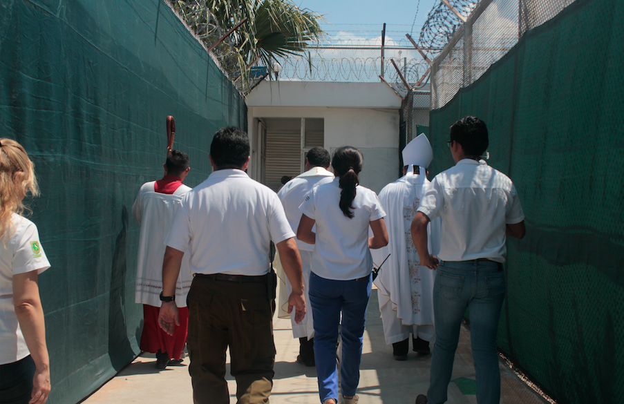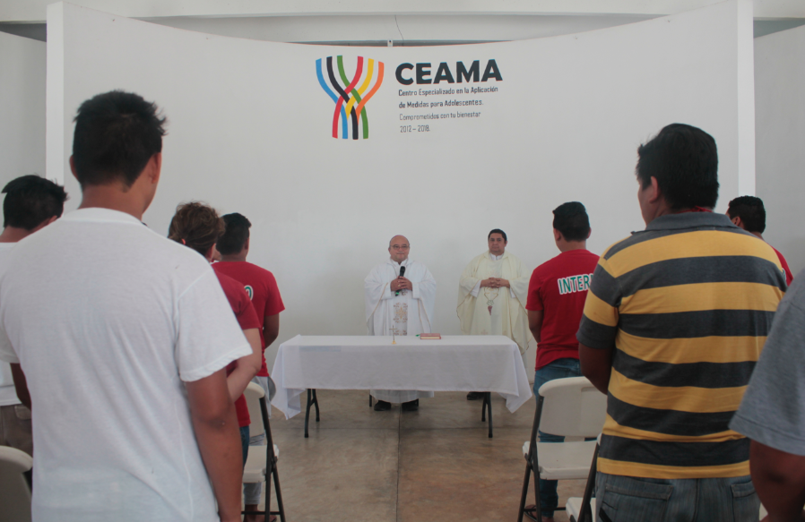 Mérida, Yucatán, 29 de marzo del 2018.- Ante un reducido grupo de familiares, El Obispo auxiliar de Yucatán, Pedro Mena Díaz lavó los pies de siete jóvenes internos en el Centro Especializado en la Aplicación de Medidas para Adolescentes (CEAMA), en el marco de la celebración del Jueves Santo. El sacerdote invitó a los reclusos a seguir el camino de Jesucristo.