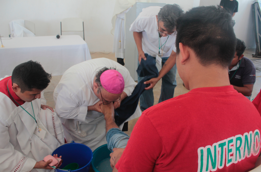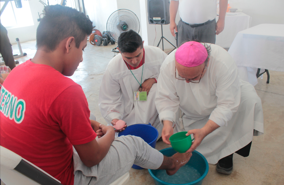 El Obispo auxiliar de Yucatán, Pedro Mena Díaz lavó los pies de siete jóvenes internos del CEAMA