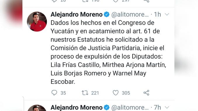 «Dados los hechos en el Congreso de Yucatán y en acatamiento al art. 61 de nuestros Estatutos he solicitado a la Comisión de Justicia Partidaria, inicie el proceso de expulsión de los Diputados: Lila Frías Castillo, Mirthea Arjona Martín, Luis Borjas Romero y Warnel May Escobar«, se lee en twit.