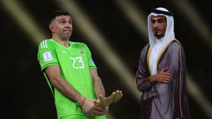 Ciudad de México, México, 19 de diciembre del 2022.-En redes sociales se hizo viral el festejo que hizo el guardameta Emiliano ‘Dibu’ Martínez en el momento en que recibió el trofeo de mejor portero del Mundial de Qatar 2022.