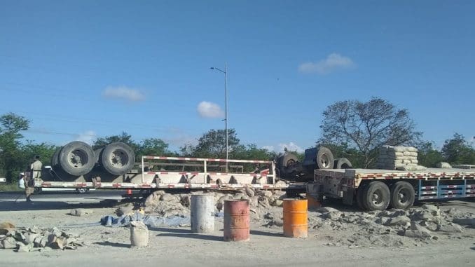 Mérida, Yucatán, 28 febrero 2022. – Varios curiosos que presenciaron la volcadura de un tráiler cargado con 20 toneladas de cemento se quedaron con las ganas de la rapiña, pues elementos de la Secretaría de Seguridad Pública aseguró el camión y su carga vertida en el piso.